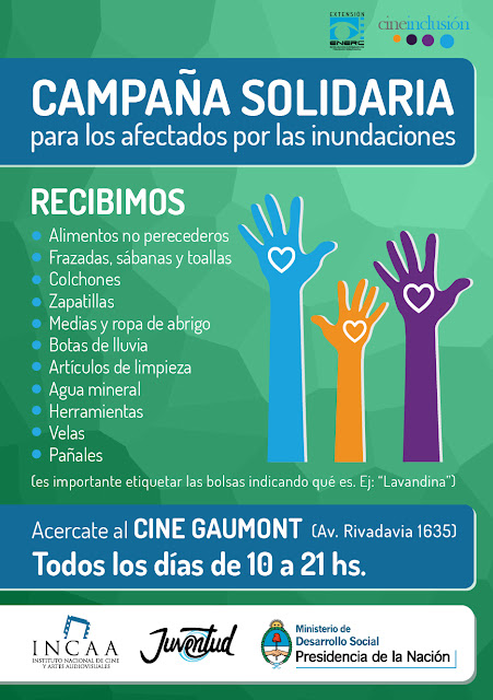 Debido a las inundaciones que afectan severamente diversas localidades de nuestro país, el INCAA en coordinación con el Ministerio de Desarrollo Social de La Nación, suma su aporte a la