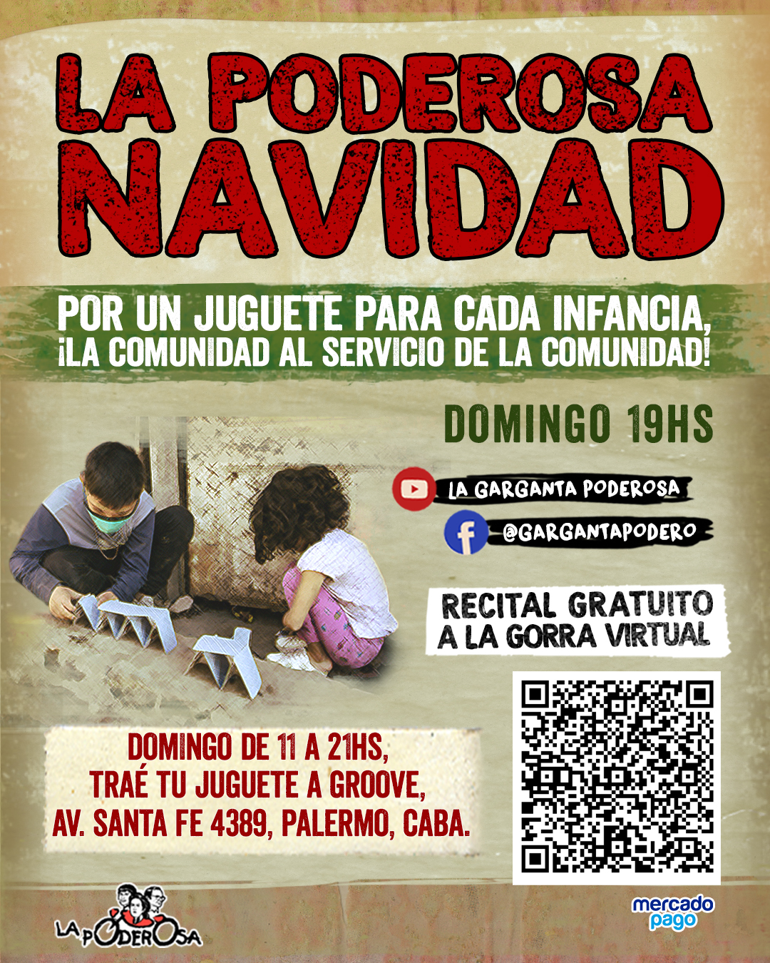 Este año afrontamos mil batallas, pero este domingo nos permitiremos cerrar el año bien arriba: vamos a festejar La Poderosa Navidad de manera colectiva, abrazándonos a la solidaridad de diferentes artistas que compartirán su grito para tocar en un show gratuito. Desde ahora quedará abierta nuestra gorra virtual para colaborar, así nadie se queda sin regalos ni pierde el derecho a jugar; también podrán acercarse a la puerta de Groove este domingo de 11 a 21hs, donde estaremos recibiendo juguetes para las y los pibes de nuestros barrios que tanto sufrieron la pandemia de la desigualdad.